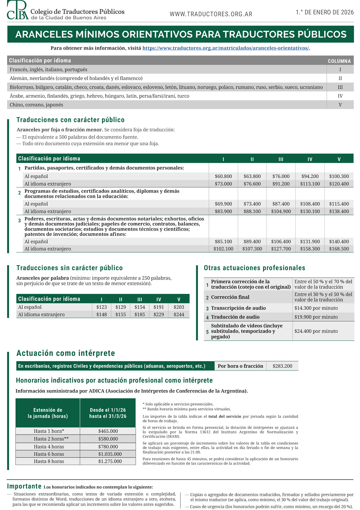 El Consejo Directivo recomienda a todos sus matriculados respetar los valores publicados y les recuerda lo dispuesto por el artículo 10 del Código de Ética: «Cualesquiera que sean el ámbito y las circunstancias de su labor profesional, el traductor público debe convenir con su cliente o destinatario de su traducción los honorarios establecidos por el CTPCBA o por la ley de honorarios para traductores públicos, si la hubiere. Deberá abstenerse de cobrar honorarios que impliquen o estimulen la competencia desleal».