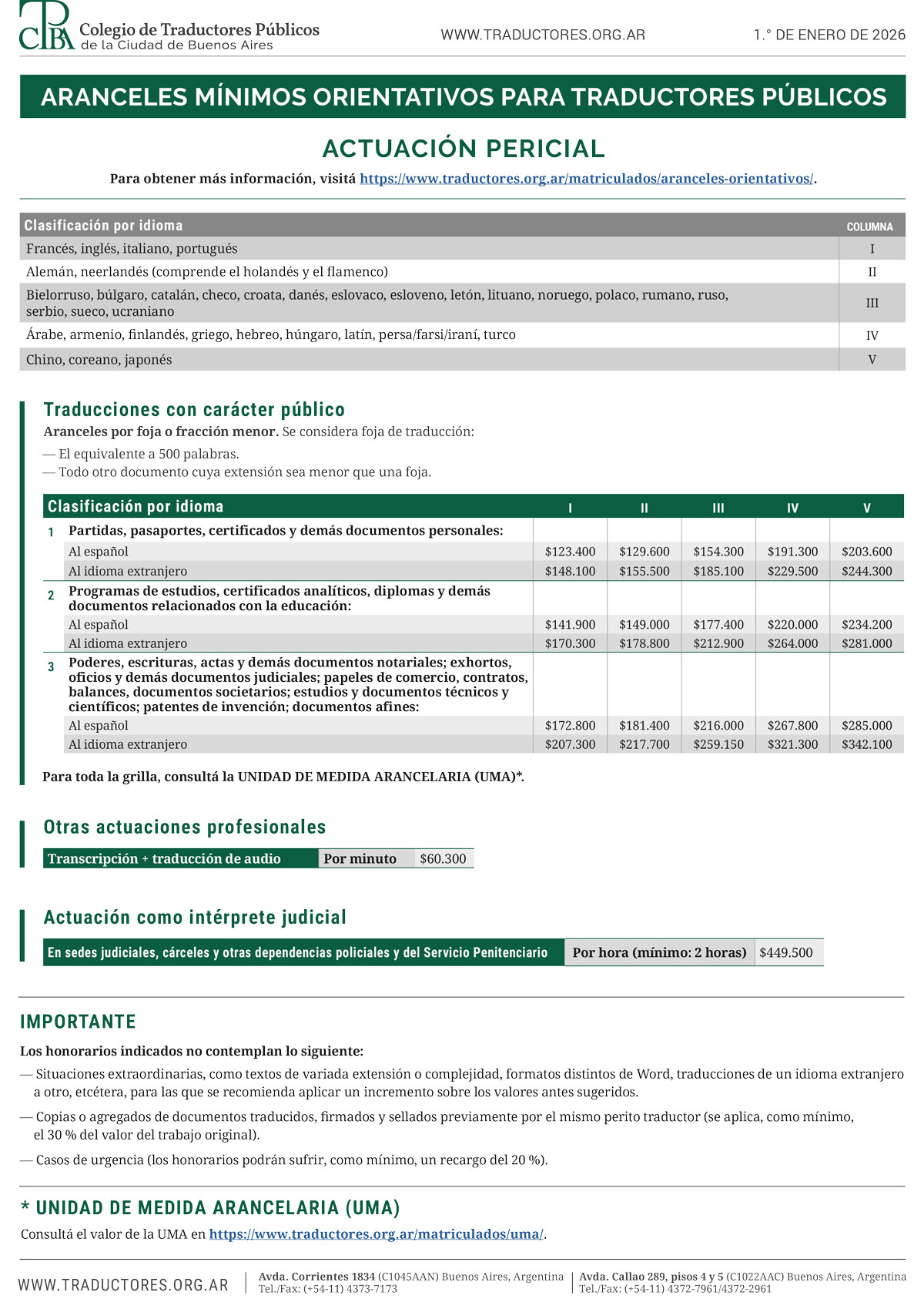 El Colegio de Traductores Públicos de la Ciudad de Buenos Aires brinda a sus matriculados un listado de aranceles mínimos orientativos que contemplan las diferentes especialidades de labor.