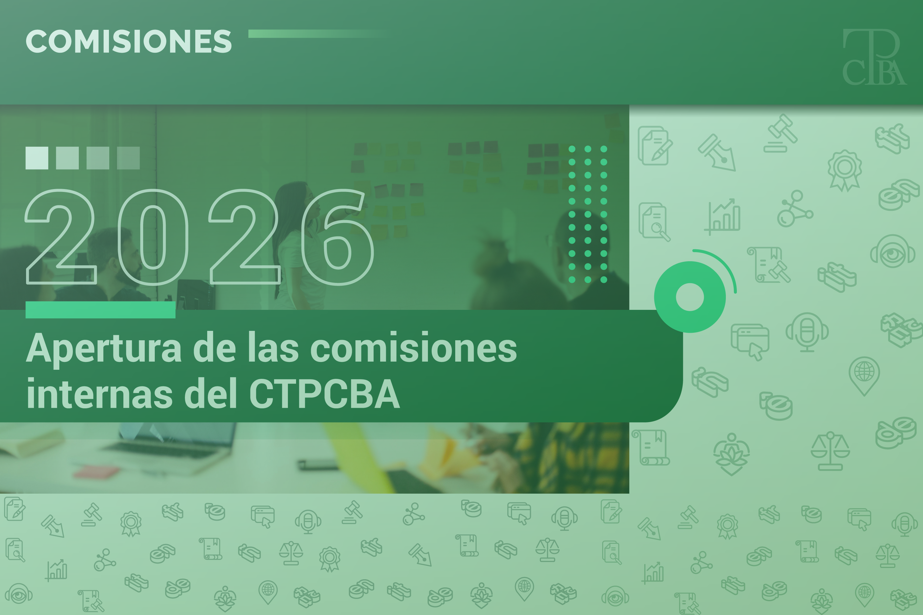 Los invitamos a sumarse a las comisiones internas del CTPCBA durante 2026. Como todos los años, el Colegio se nutre del compromiso desinteresado de sus matriculados, que contribuye a su crecimiento. Su participación es fundamental para el funcionamiento institucional y la jerarquización de la profesión.