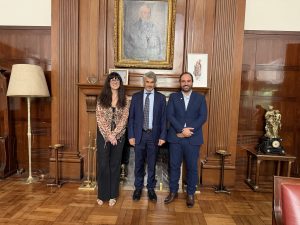 Como parte de las acciones de vinculación institucional que lleva adelante el Consejo Directivo, Damián Santilli, presidente del Colegio, y Alide Drienisienia, secretaria general, se reunieron con el decano de la Facultad de Derecho de la Universidad de Buenos Aires (UBA), Dr. Leandro Vergara, con motivo de la firma de la renovación del convenio de cooperación que el Colegio mantiene con dicha casa de estudios.