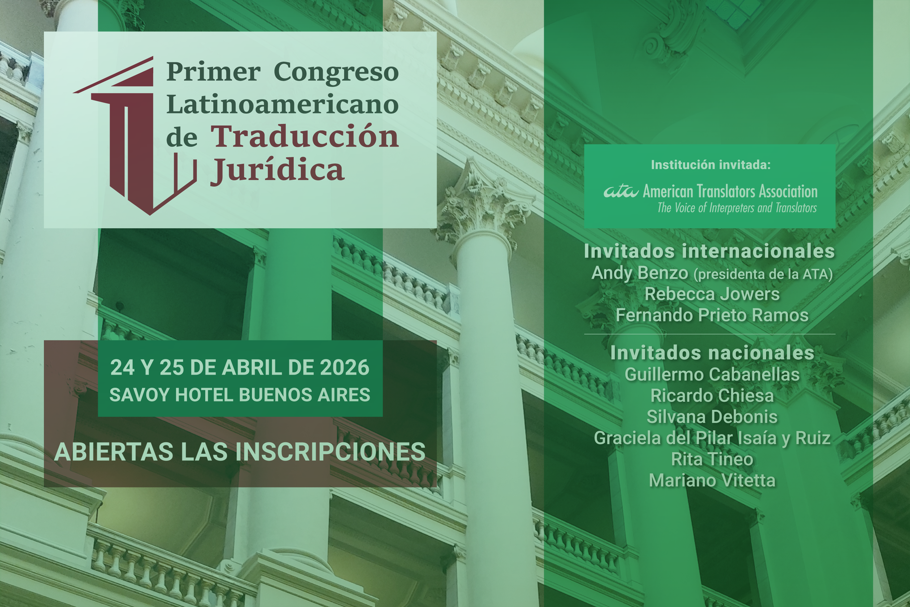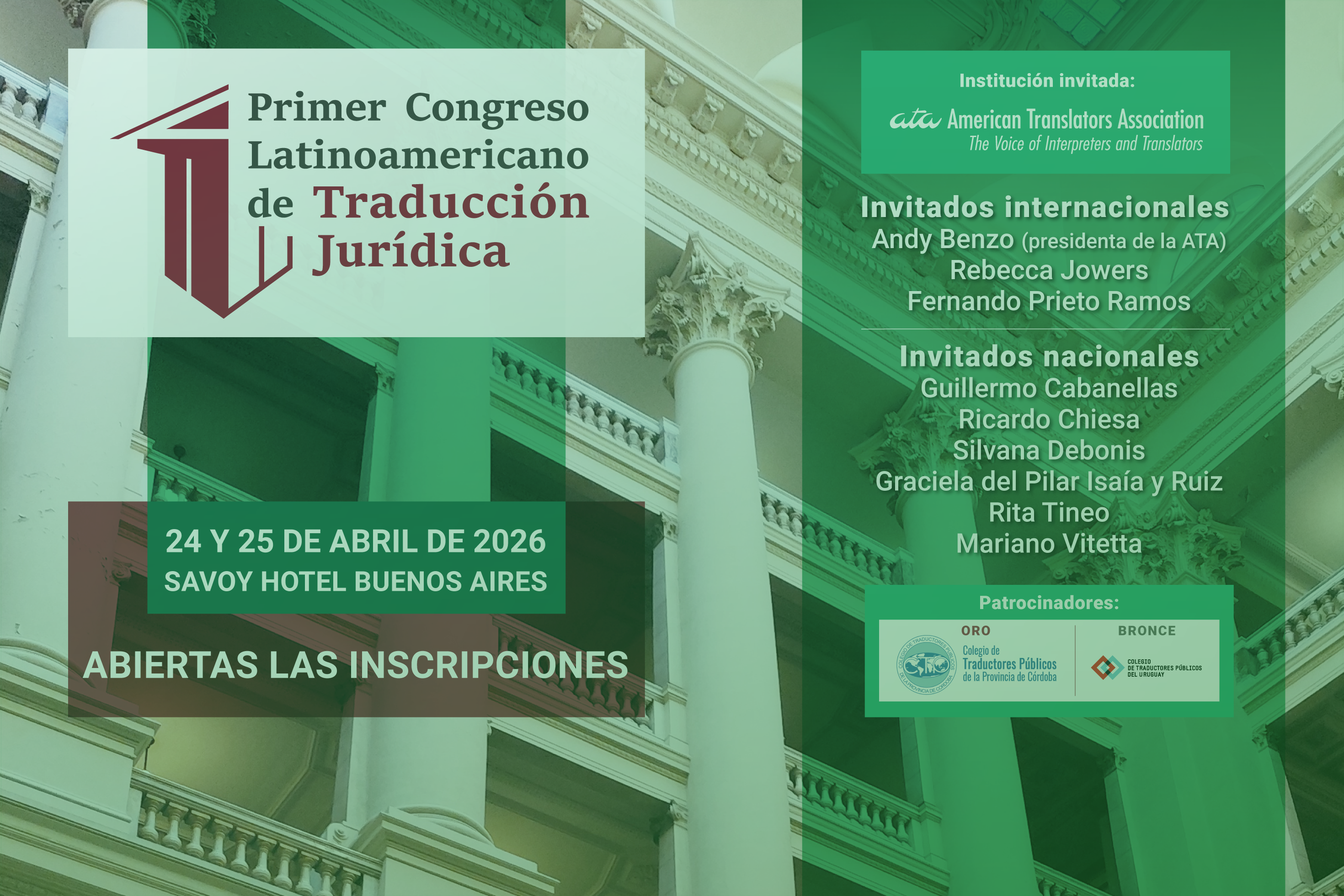 El CTPCBA se enorgullece de anunciar y organizar el Primer Congreso Latinoamericano de Traducción Jurídica, un evento sin precedentes en la región, el cual se celebrará el 24 y 25 de abril de 2026, en el Savoy Hotel. Una oportunidad única para actualizar y profundizar conocimientos con enfoque práctico y mirada actual, de la mano de referentes nacionales e internacionales de primer nivel.